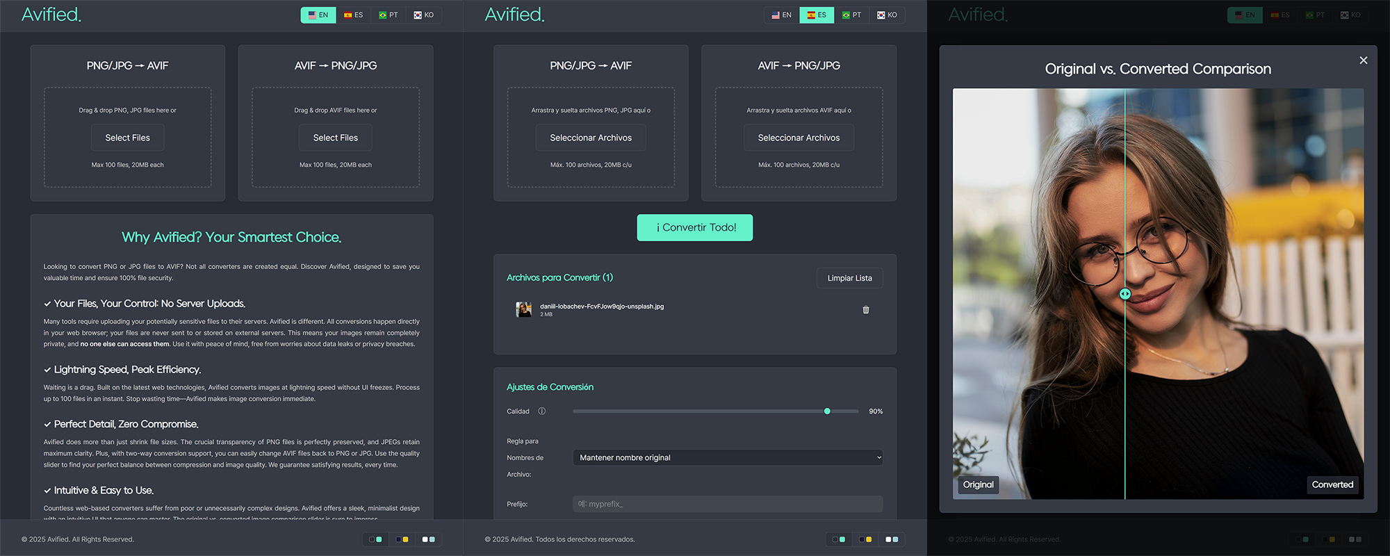 예를 들면 무료 온라인 이미지 컨버터(변환기)인 에이비파이드(Avified) 같은 서비스는 별도의 프로그램을 설치할 필요 없이 웹 브라우저에서 곧바로 PNG나 JPG 파일을 AVIF로 바꿔주거나, 그 반대의 역변환 작업도 지원해 줍니다. 최대 100장까지 일괄 처리도 지원하며 속도도 빨라 편하게 사용 가능하지요.