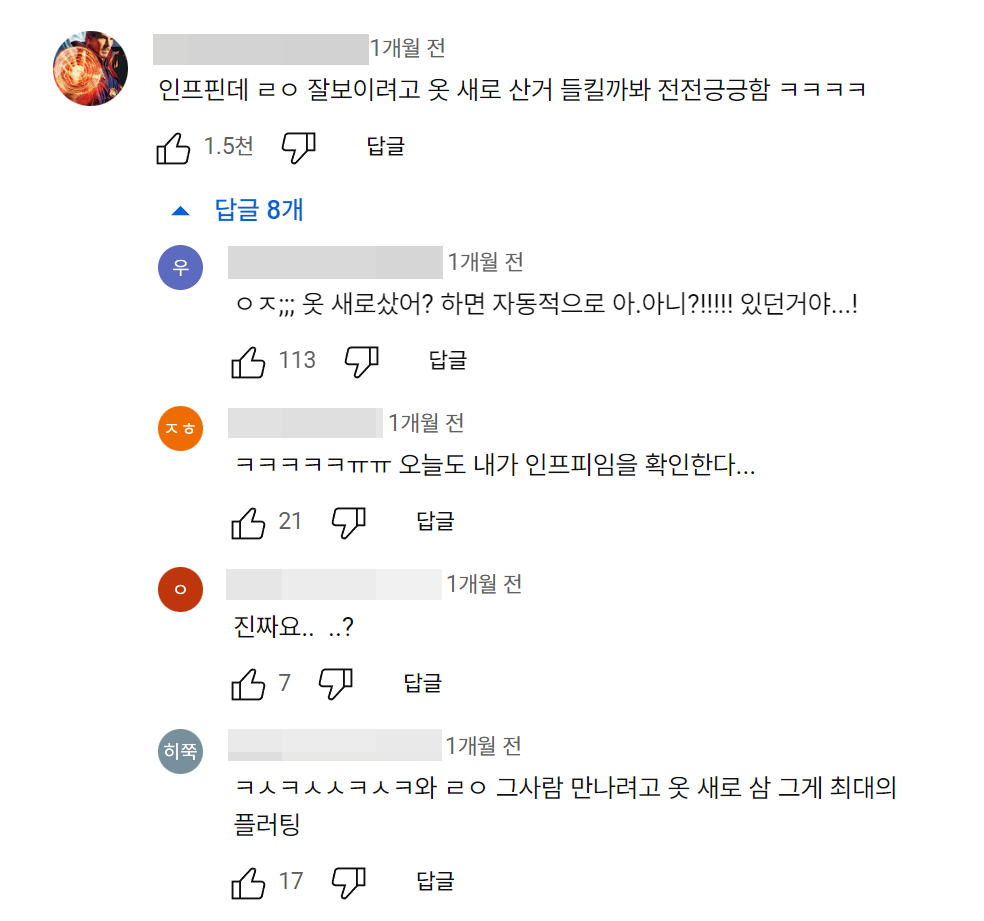 옷만이 아니라 화장을 좀 신경 써서 했다든지 평소에 안 쓰던 향수를 뿌렸다든지 하는 부분도 인프피식 플러팅에 해당합니다. 근데 이거를 알아챈 티를 내면 안 됩니다. "향수 뿌렸어?" "오늘 좀 꾸몄네?" "왤케 이쁘게 하고 왔어?" 같은 소리를 하면 인프피는 자기 마음이 다 들킨 것 같아서 집에 가고 싶어지기 때문입니다. 물론 겉으로 티가 많이 나는 건 사실이지만 그냥 알아챘으면 잘해주도록 합시다.