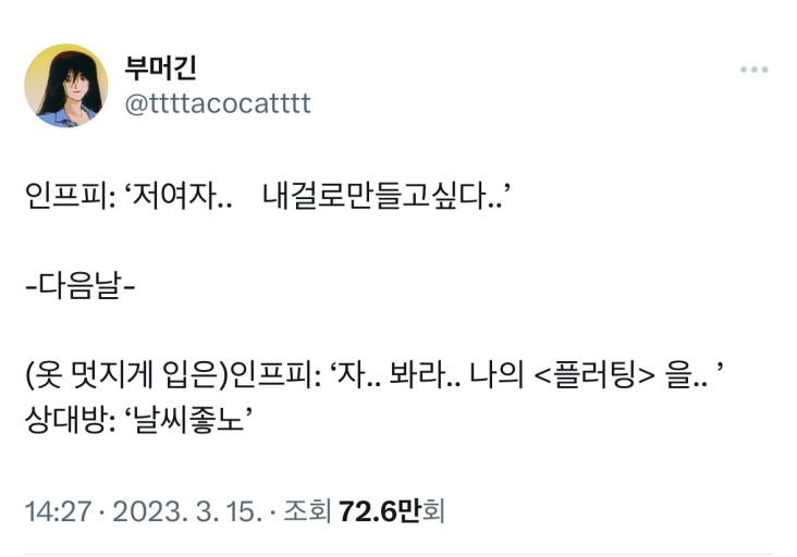 특히 갑자기 매우 개인적인 이야기를 꺼내는 것도 인프피 플러팅의 특징 중 하나입니다. 이것은 상대에게 자기만의 세상을 공유하고, 나름 유머 감각/센스를 보여주려는 시도입니다. 하지만 이미 긴장한 상태이기 때문에 상대에겐 귀엽거나 웃겨 보이기 쉽습니다.