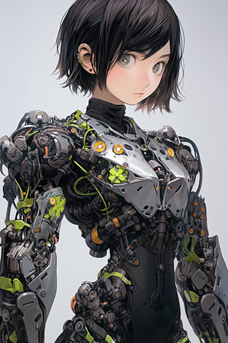 robot girl, mechanical arms, detailed cute face, black hair, blunt bangs, best quality, in the style of realistic and hyper-detailed rederings --s 700 --no letterbox --ar 2:3 --niji 5 --style expressive
