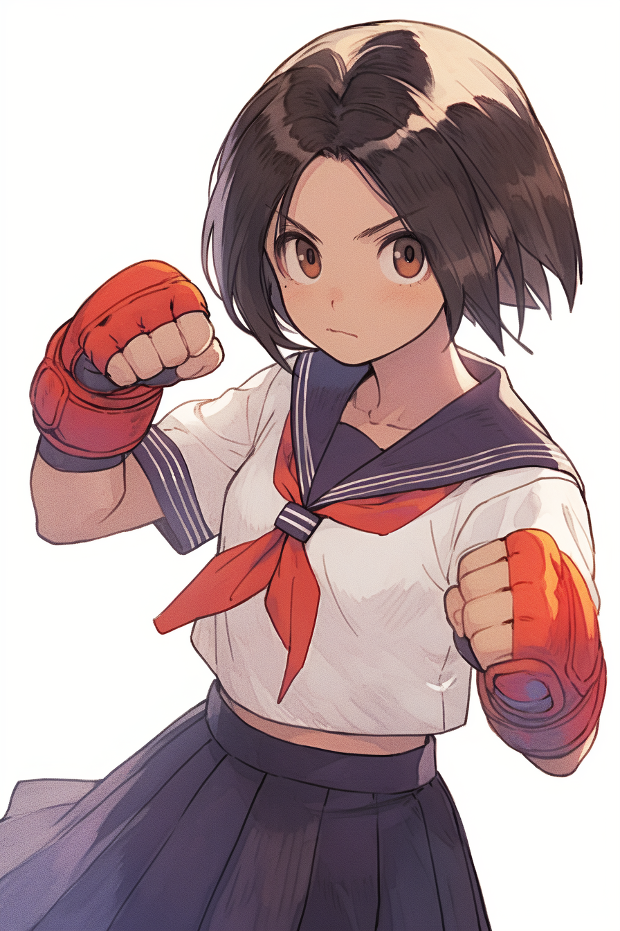 1 girl, school uniform, short pleated skirt, karate girl, kickboxing pose, wrist bandage, determined expression, ready to fight, hyper-realistic but styliezed, detailed pretty face, I can't believe how beautiful this is, intricate details --ar 2:3 --s 100 --niji 5 --style cute