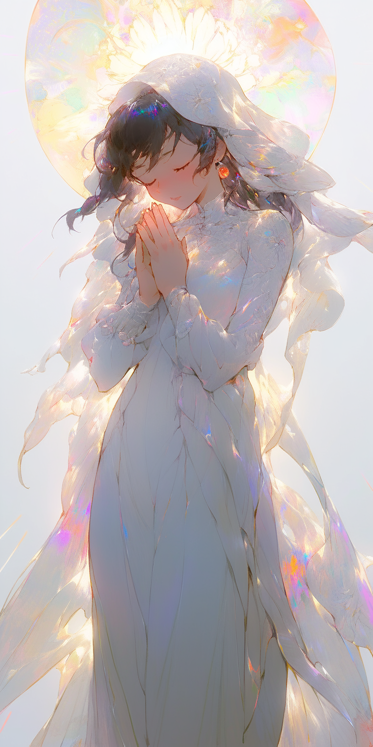 goddess in light, closed eyes, prayer hands, cowboy shot, light particles, white theme, ethereal atmosphere, iredescent holographic colors, I can't believe how beautiful this is --ar 1:2 --s 350 --no letterbox --niji 5 --style expressive