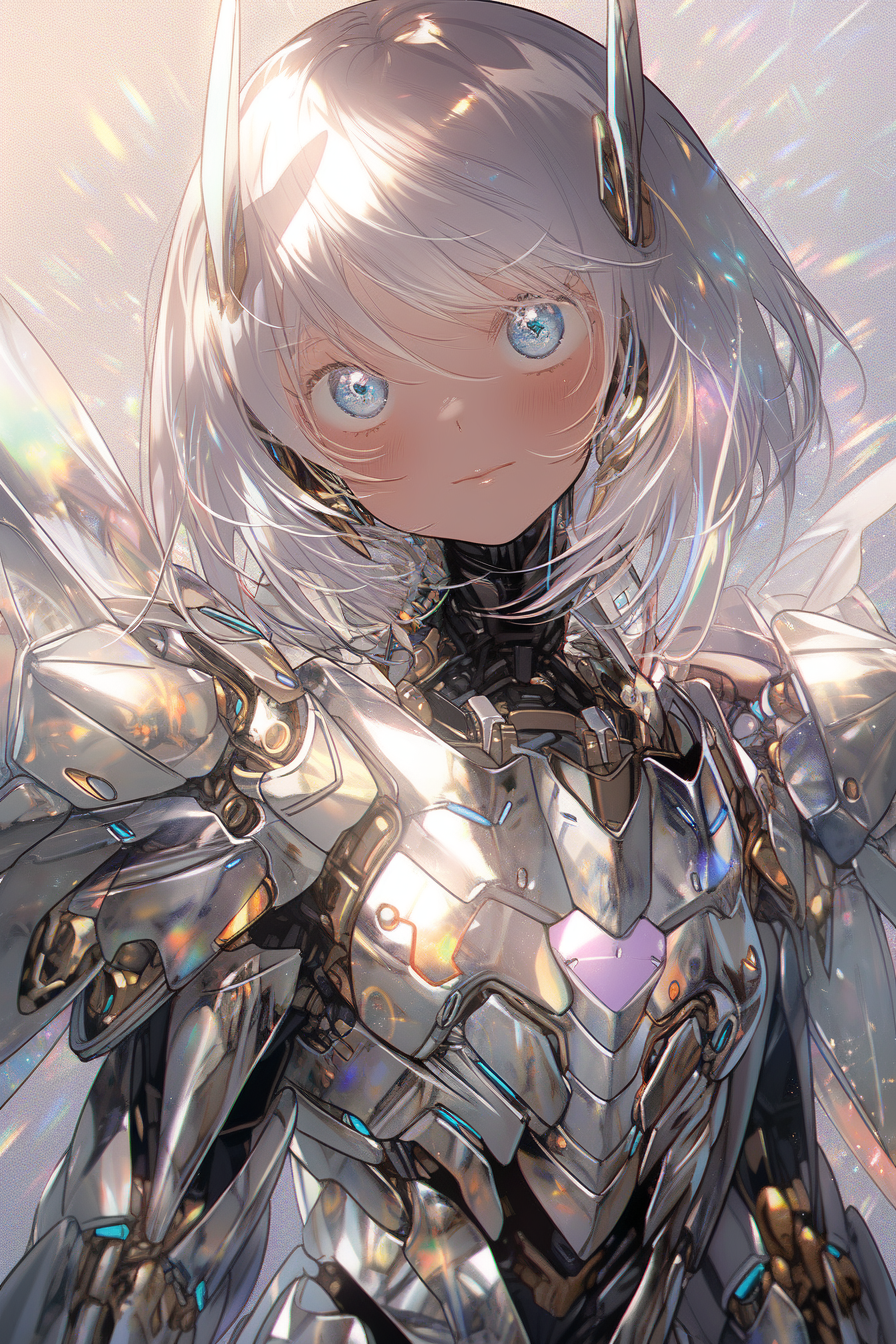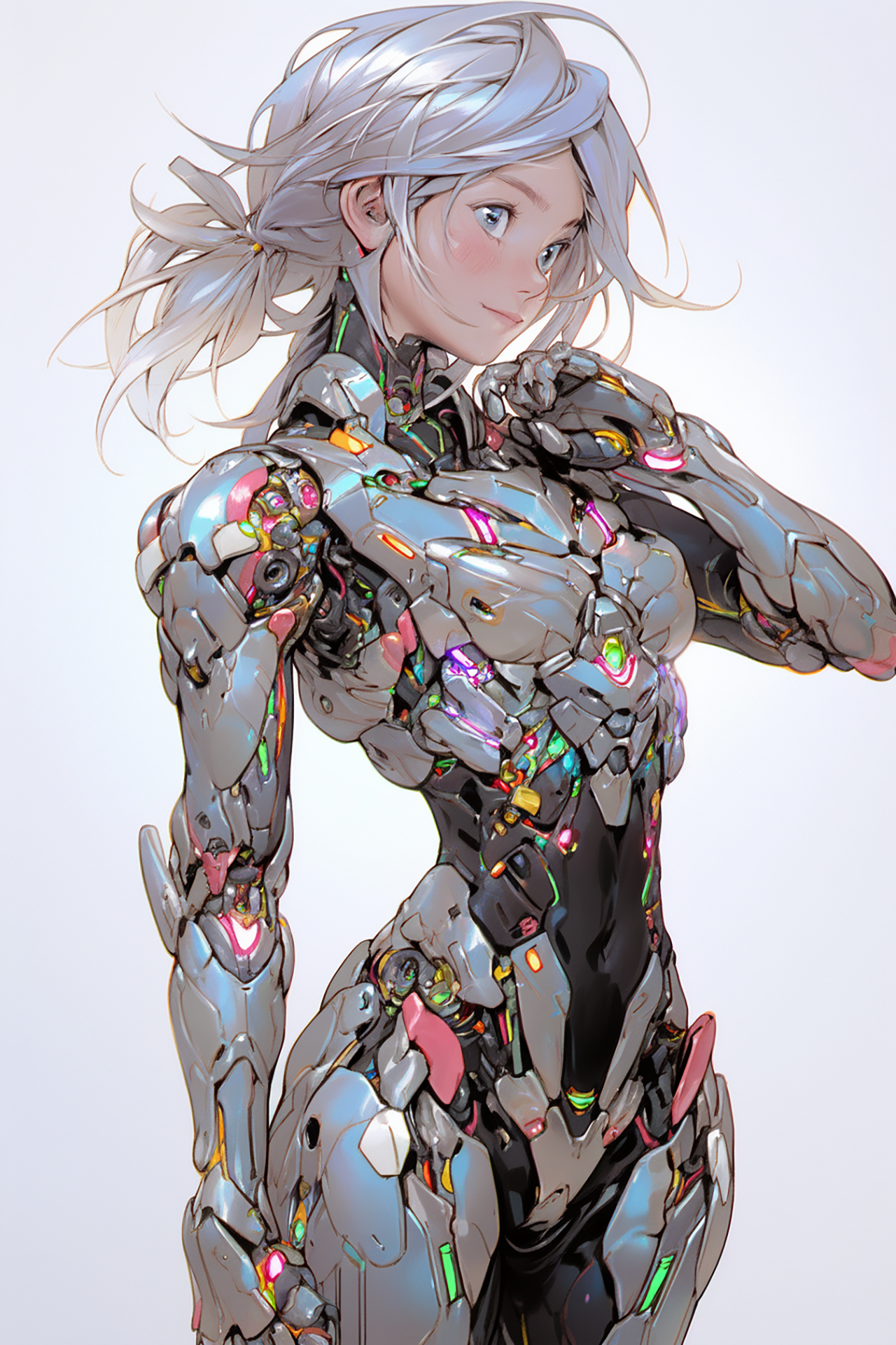 1 girl, relaxed expressions, detailed pretty face, detailed mechanical arms and hands, perfect lovely girl body, iredescent holographic colors, hyper-realistic but stylized, I can't believe how beautiful this is --ar 2:3 --s 350 --no letterbox --style expressive --niji 5