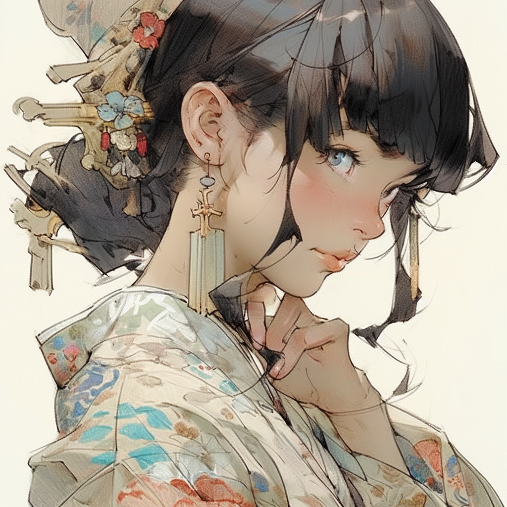 best quality, japanese bride, traditional clothes, detailed pretty face, detailed eyes, sketch, delicate line art, watercolor, intricate details, jewel, hyper-realistic oil, contoured shading, I can't believe how beautiful this is --ar 1:1 --s 700 --niji 5 --style expressive
