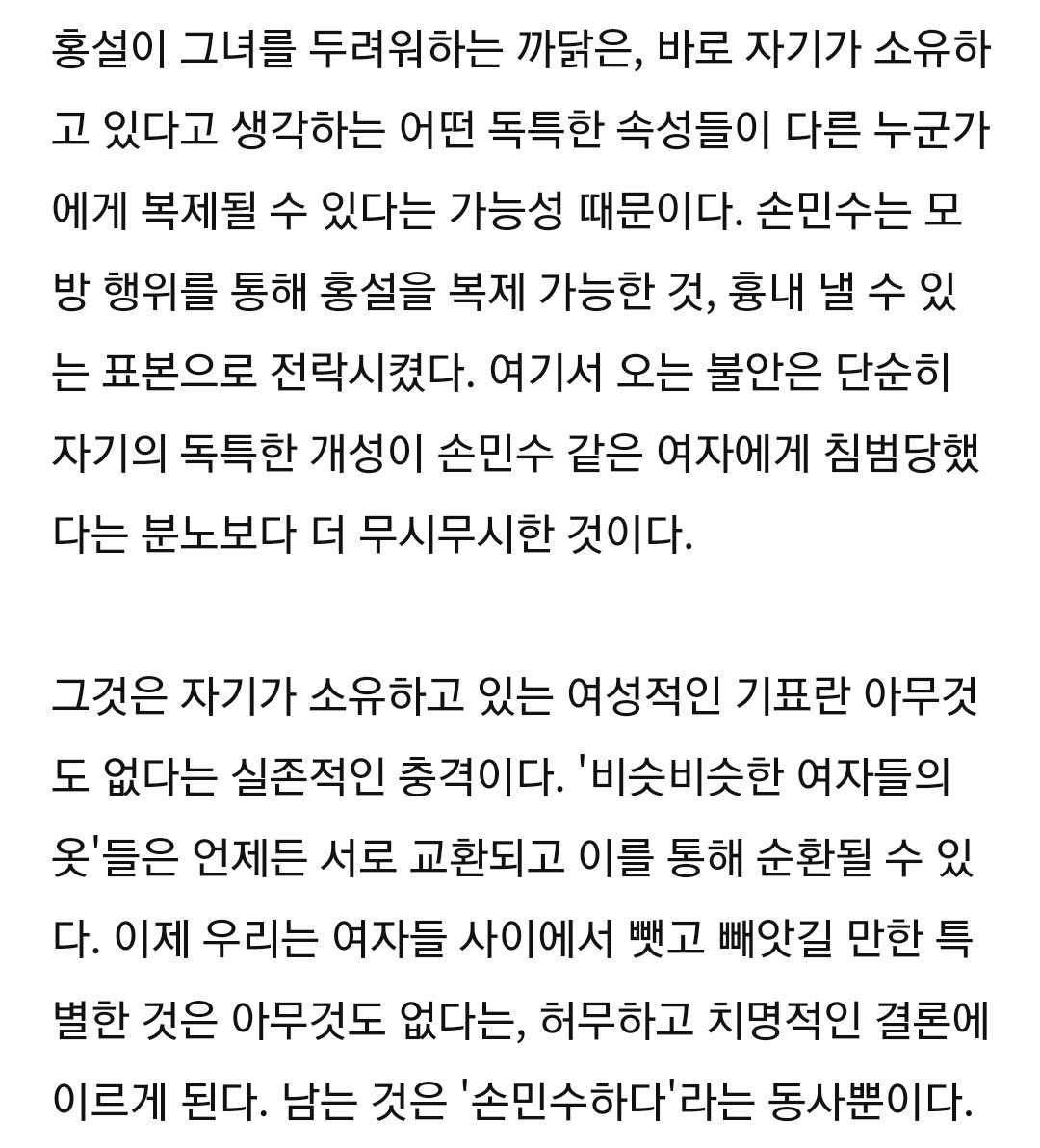 손민수는 평소 학과 내에서 주눅 든 아웃사이더 같은 인물이었지만, 주인공 '홍설'을 동경해 옷과 헤어 스타일, 행동, 화장을 따라 하고 심지어 성형까지 불사하는 모습을 보여줬는데요.