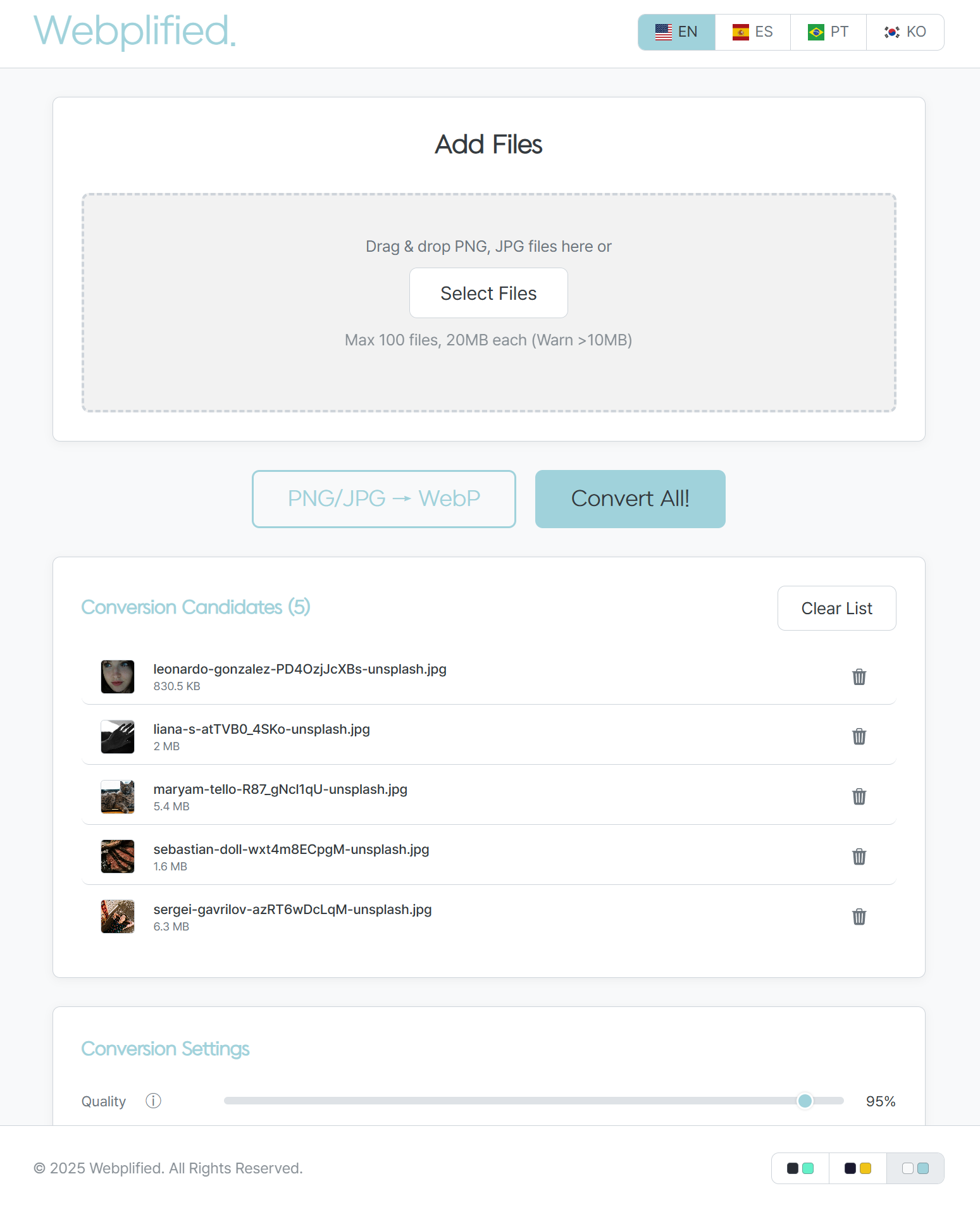 컨버터는 워낙 경쟁자가 많은 종류의 툴이지만 웹플리파이드는 충분한 경쟁력을 갖춘 무료 앱인 것 같습니다. 강력하고 빠르고 일괄 처리까지 가능한 무료 PNG2WEBP 변환기를 찾고 계셨다면, 좋은 해답 중 하나가 바로 웹플리파이드가 아닐까 생각합니다.