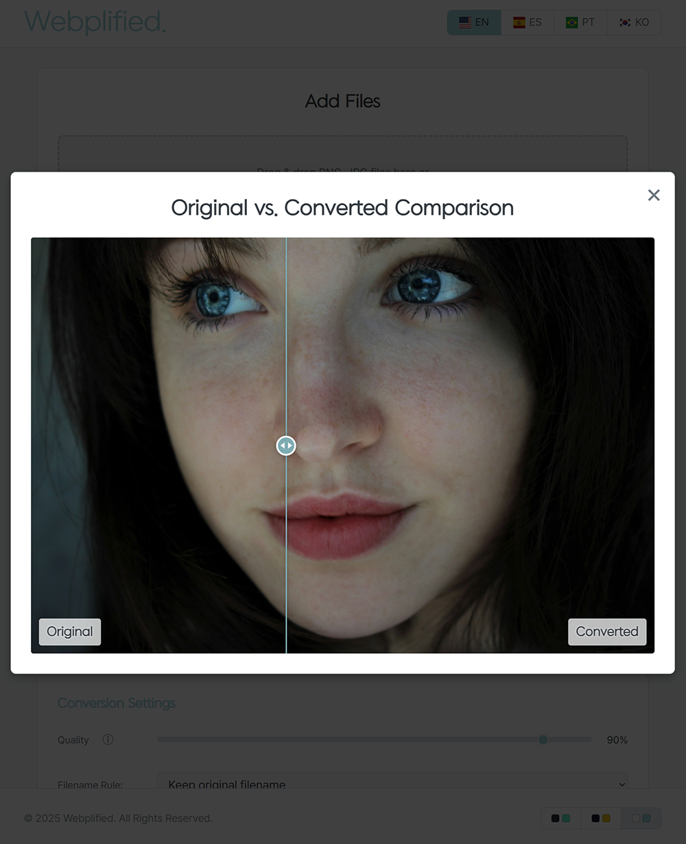 - 사용자 친화적인 경험: 웹플리파이드의 또 다른 강점은 누구나 쉽게 사용할 수 있는 직관적이고 미니멀한 UI를 제공한다는 것입니다. 변환 직후 목록에서 비교 버튼을 누르면 화질을 직접 비교할 수 있는 슬라이더 기능도 있고, 또 변환된 파일 전체를 ZIP으로 한 번에 다운로드하는 기능 등 사용 편의를 위한 강력한 기능들을 모두 무료로 제공합니다. 상당히 보기 드문 고품질 무료 웹 컨버터 서비스라고 볼 수 있겠습니다.